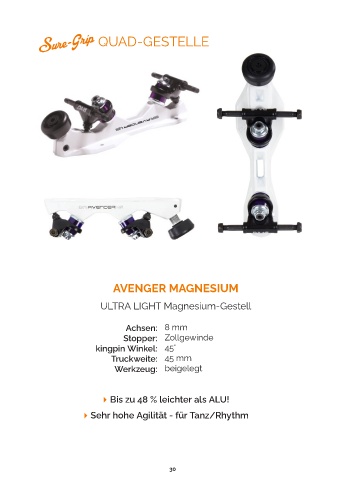 QUAD-GESTELLE AVENGER MAGNESIUM ULTRA LIGHT Magnesium-Gestell Achsen: 8 mm Stopper: Zollgewinde kingpin Winkel: 45° Truckweite: 45 mm Werkzeug: beigelegt 4Bis zu 48 % leichter als ALU! 4Sehr hohe Agilität - für Tanz/Rhythm 30